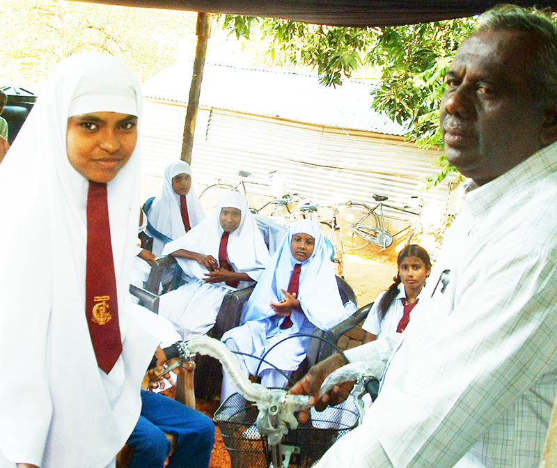 Mr.Thilakeratnam hands over a bicycle to a student.