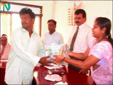 WFP programme assistant Ms Rebecca Miranda hands over food basket to a returnee from Tamilnadu. Trinco Divisional Secretary Mr.Arumainayakam and Deputy Director of Planning Mr. V.Suntharalingam are seen