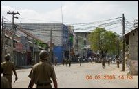 All roads leading to Jaffna were blocked by rioters with burning tires and logs. The northern town was deserted. Hundreds of SLA troops and riot Police patrolled its empty streets. Mr. Vincent L Jeyan, the Lake House journalist who was assaulted and injured by the military was also admitted to Jaffna Hospital for treatment. Several computers at an internet café where he sought refuge were smashed by soldiers who pursued him for taking photos of the fracas in Jaffna town. The motorbike of Mr. Ratnam Thayaparan, Jaffna correspondent for the Tamil daily Thinakkural was damaged by troops. Police and military arrested ten civilians in several parts of the town, sources said. Soldiers who assaulted civilians and students in Thinnevely attacked the main office of the International Federation of Thamil Eelam Students at the Parameswara Junction. The man who was shot dead by troops near Jaffna University was identified as Mr. M. Kathirgamu, 65.