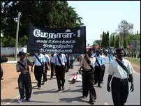 Mr. Vettiarasan, the president of the Kilinochchi Traders' Union lit the Common flame while Mr. Para, the head of the Liberation Tigers of Tamil Eelam LTTE) Law and Administration division, hoisted the National flag. "We, the Tamil workers of Sri Lanka are unable to celebrate May Day along with the workers of the world and have chosen to observe this as day of grief to the entire Tamils in Sri lanka who are suffering under the Sri Lanka state and its armed forces. We call upon the workers of the world to exert pressure on the Sri Lanka government to pay heed to the advice of the international peace-makers," said Mr. Ganeshapillai, the President of the Kilinochchi district non-governmental organisations. "Tamil farmers, fishermen, labourers and other daily wage earners are unable make ends meet because of the restrictions placed on them. Sri Lanka Army (SLA) has displaced farmers from their lands declaring the fields as High security zones. The Tamil fishermen are not allowed to fish in NorthEast seas due to fear of the Sri Lanka navy," said Mr. Sivapalan, Secretary of Kilinochchi district Nation upsurging Forum, in his address. "The aerial bombing and artillery attacks on innocent civilians have made thousands of people to flee from their homes. We call upon the international community to raise its voice against these violence against the Tamils," said Mr. Vettiarasan in his speech. "The effigies symbolize the Sinhala extremist leader who are unwillling to make progress towards a just and fair solution to the Tamil National quetsion," said the participants in the May Day march.