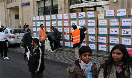 More than 3,000 Eelam Diaspora Tamils in Germany, organised by 16 Tamil organisations, demonstrated on Friday through a central part of Berlin, exhibiting humanitarian supplies that they have collected to be sent to their kith and kin in Vanni, urging the International Community to facilitate transport from Colombo to Vanni.