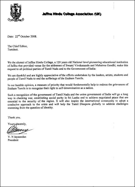 The statement signed by the president of the association, V.N. Jayasealan said this is a measure of priority and such recognition from the State of Tamil Nadu and the Government of India will help in a big way in checking war and achieving negotiated peace in Sri Lanka, besides inspiring the International Community in adopting an appropriate approach to the crisis. Significantly, Eezham Tamil grass-root level institutions of non-political and non-militant nature are watching the developments in Tamil Nadu with great interest and are eager to convey what they think. A decision in this regard was taken in a meeting of several organizations in Canada recently. According to Prof. R. Cheran, sociologist of Windsor University, Canada, more than 350 associations representing villages and a number of alumni associations of the educational institutions of Eezham Tamils operate in Canada alone.  Letter from the Jaffna Hindu College Association (UK)