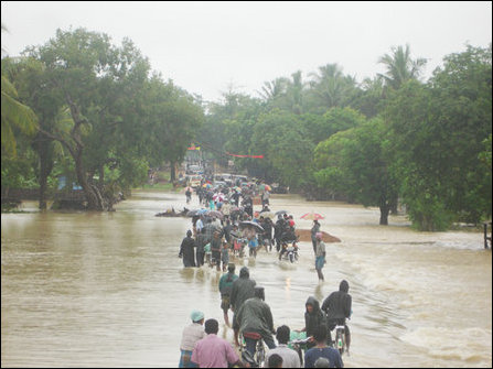[TamilNet, Tuesday, 25 November 2008, 12:30 GMT]Continuous torrential rain for four days in several areas of Vanni has caused floods, destroying temporary huts of war-displaced civilians and disrupting transport on several roads of densely populated Northeastern region of Vanni. Several hundred volunteers of Tamils Rehabilitation Organisation and other local NGO were struggling to assist the displaced civilians to find shelter in various schools, churches, temples and other public places as thousands of civilians, forced to vacate their houses due to the Sri Lankan military offensive into Vanni, were deprived of proper shelter by the blockade imposed by the Sri Lankan government.