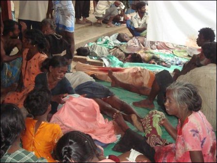 Mullaiththeevu Medical Superintend V. Shanmugarajah narrowly escaped Wednesday from Sri Lanka Army fired Multi Barrel Rocket Launcher (MBRL) shells that hit Mu'l'livaaykkaal inside the 'safe zone', and a 7-year-old child was killed in long distance gunfire near the inland waters in Maaththa'lan. Totally, 82 civilians were killed and more than 130 wounded. Civilians who were waiting in queue to receive humanitarian supplies were hit by the MBRL and artillery fire. More than 500 patients were struggling without shelters and medical treatment amidst heavy rains.