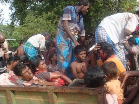 72 civilians were killed on Friday, 26 of them had succumbed to gunfire wounds. A makeshift-road between the shore and the compromised road along the lagoon-side was being used for civilian movement. Vehicular movement has become severely affected due to the floods and the prevailing security threat. Thursday was the worst day inside the safety zone. The makeshift hospital at Puthumaaththa'lan reported that it received 324 injured civilians. Many of the victims were injured in SLA shelling and a few due to gunshot injury. 49 civilians died after admission. The casualty figures were much higher than what was reported by the medical sources as many of the dead were not brought to the hospital.  Wounded civilians being rushed to makeshift hospital