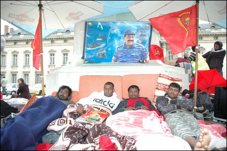 The protests against the carnage of innocent Tamil civilians in Vanni held in order to draw the attention of the International Community (IC) by French diaspora Tamils, launched in several popular places in Paris, reached its sixth day Saturday. Four Tamil youths are fasting unto death in the protest demonstration being held for the last two days near the Wall for Peace in Paris near the French Military Academy, the sources added. Members of Tamil Youth Organization (TYO) in France distributed pamphlets describing Sri Lanka government’s genocide of the Tamils to the tourists who visit the Wall for Peace monument from all over the world.