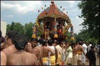 Several hundred saiva devotees from different parts of the U.S. Saturday attended the Washington Murugan Temple chariot festival held annually to coincide with the festival at the Nalloor Kandaswamy Temple in Jaffna. A new chariot funded by Sri Lanka's Tamil expatriates in New York, built in Colombo by Jaffna craftsmen, shipped to the U.S., and assembled locally, made the maiden-run Friday in preparation for the Saturday ceremony. Cognizant of the hardships suffered by relatives and friends inside internment camps, devotees kept the festivities outside the temple at a low-profile, attending devotees said.