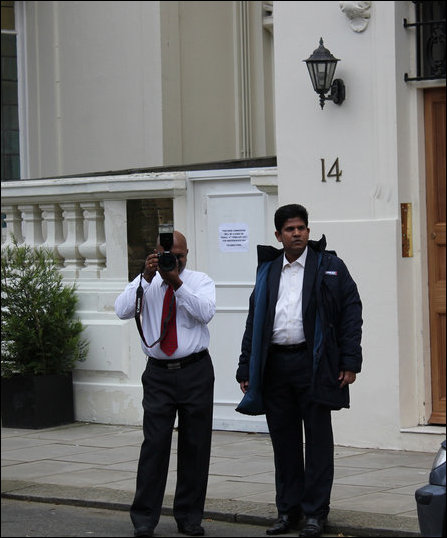 Shortly after the demonstration began outside the High Commission, a squad from the Diplomatic Protection Group hurriedly arrived with motorcycles escorting their two characteristic red-liveried vehicles
