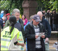 TYO activists wearing yellow dayglo jackets, set up at 10am in the persistent rain as the first spectators began arriving for the 11am match start.