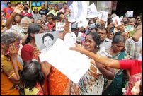 For the first time in Jaffna, kept under the iron fist of occupying SL military, parents and relatives of the missing persons, braved SL army barriers and harassment by the occupying soldiers and riot police and staged a protest in front of Jaffna Bus stand on Wold Human Rights Day seeking global attention on the plight of those reported missing since the end of Vanni war in 2009. The SL military and police blocked the organisers from Colombo, the Civil Monitoring Commttee of missing persons, at Veampadi in Jaffna, for hours blocking them from reaching the site of the protest. The protestors managed to intuitively stage the rally without the organisers, political observers in Jaffna said. In the meantime, a JVP dissident group member, Lalith Weeraraj, who was on his way to the protest site has been reported missing at Aavarangkaal. The SL Police attacked reporters covering the protest.