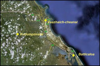 The location of Kudumpimalai (Barren's Cap) from Batticaloa and Vaazhaich-cheanai