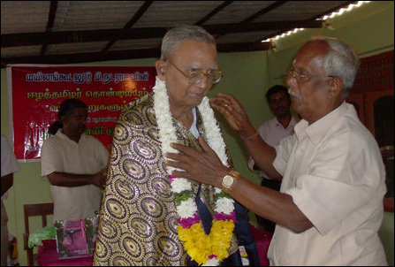 Professor Sivalingarajah garlanding Mr Nadarajan [Photo courtesy: thirdeye2005.blogspot.com]