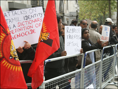 The demonstrators in the UK further asked whether India was completely immune to the sentiments of the Tamils worldwide and the Tamils in Tamil Nadu by entertaining a representative of a state that was resposnible for one of the worst genocides in the 21st century, sources told TamilNet. The demonstration in London was arranged by TCC-UK.