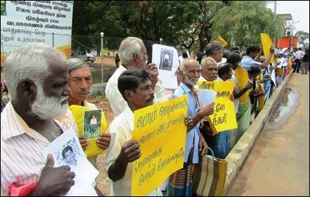 More than 50% of the participants, who took part in a protest held opposite the District Secretariat of Ki'linochchi district on Thursday, were parents of missing persons, allegedly abducted or arrested and held incomunicado by the occupying Sri Lankan military. The protestors who carried the photos of their missing kith and kin, put forward three main demands to the SL State and to the United Nations Human Rights Council, to end Sinhala colonisation in the Tamil homeland, to ensure freedom of movement to the civilians to resettle in their own houses and to reveal the whereabouts of their loved ones. The protest, organised by the Tamil National Alliance, saw the participation of Tamil National Peoples Front (TNPF) and Democratic Peoples Front (DPF).