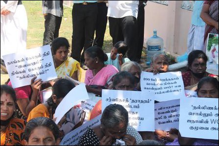 Around 150 war-victims, most of them Tamil women, who are still searching for their family members following extra-judicial abductions or arrests by the occupying military of Colombo, took part in the boycott campaign. Even the few Tamils who attended the hearings joined hands with the protesters.