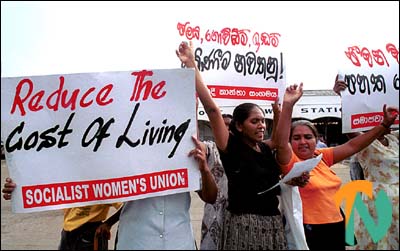 A mass protest against the rising cost of living in Sri Lanka was led Tuesday in downtown Colombo by the women's wing of the radical Marxist Janata Vimukthi Peramuna (JVP - People's Liberation Front). Hundreds of women carrying placards and shouting slogans gathered in front of the city's main railway station in Fort, Colombo's bustling business hub from 4 p.m. this afternoon for the protest. The cost of living in the island shot up when the cash strapped Sri Lankan government devalued the rupee and hiked up fuel prices last month in addition to taxes and heavy borrowing to finance a massive war budget.