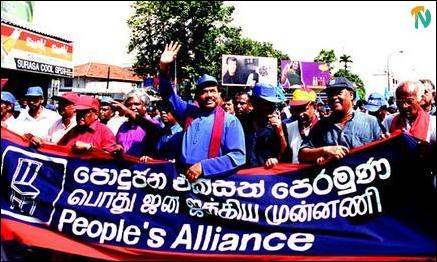 "capitalist Demon" in the JVP marchMarchers in the JVP’s May Day procession shouted slogans condemning peace talks between Colombo and the Liberation Tigers and called Mr. Wickremesinghe’s government a stooge of the US. Addressing the rally at the BRC grounds in Havelock Town, JVP speakers said that Sri Lanka’s economy is being restructured by the UNF to suit the interests of “US new colonialism”. The party has says that the peace talks are being orchestrated by the US and its allies to destabilise India. (UNF supporters, however, allege that the JVP is being manipulated with a view to minimising the influence of US and Japan in Sri Lanka’s peace process)