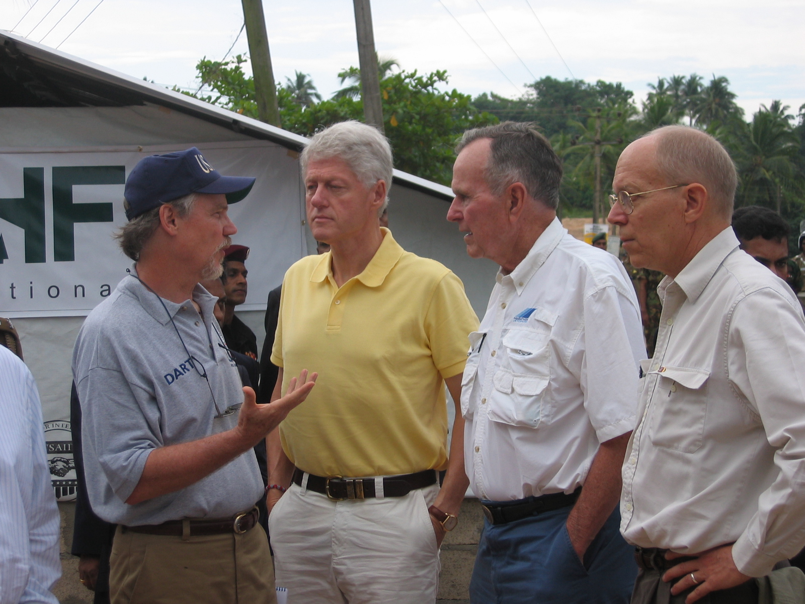 Former presidents talking to USAID officer engaged in providing temporary shelters