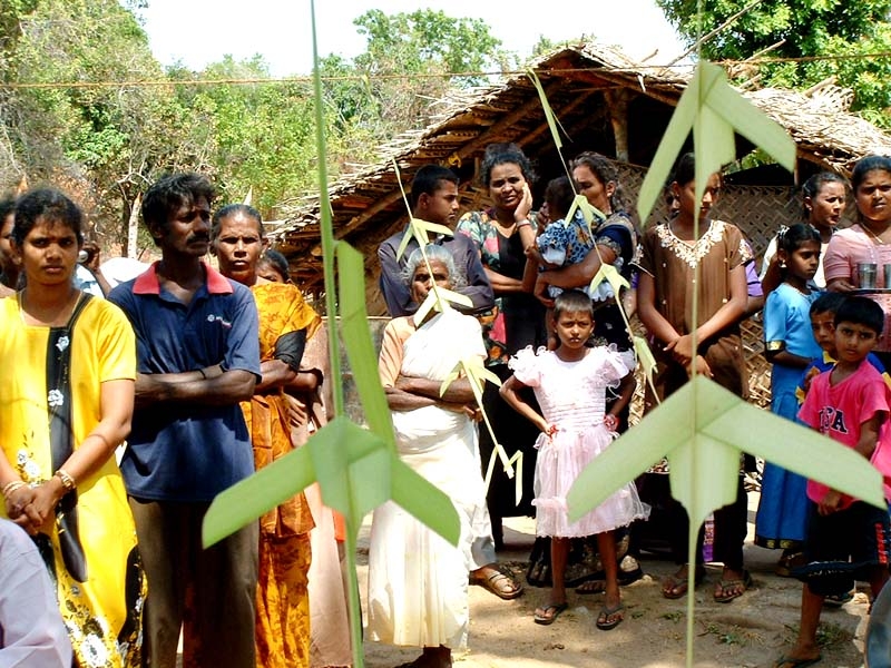 Resettled families seen in front of makeshift cadjan structure