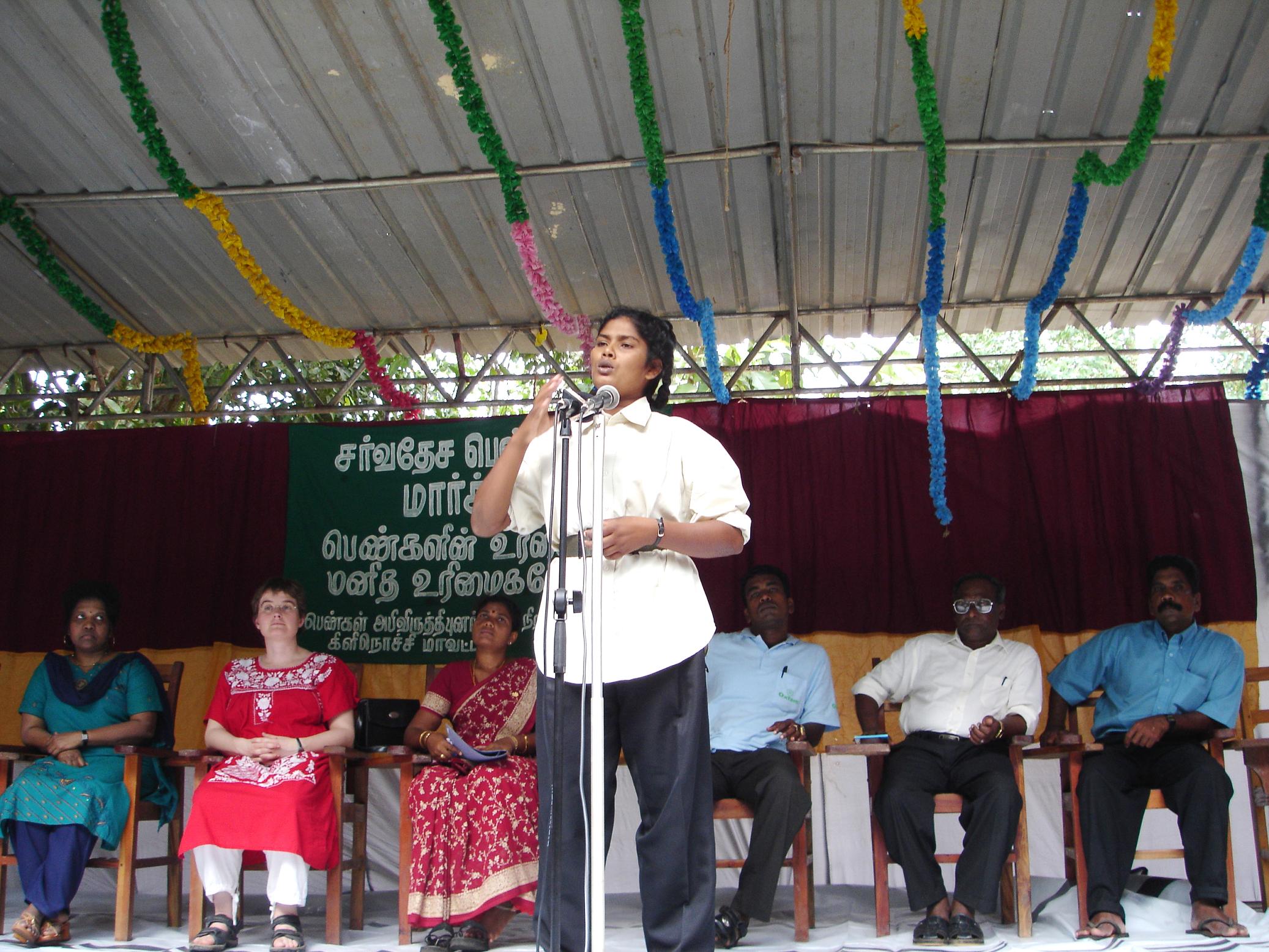 Poovili, Kilinochchi district women political head of the LTTE, delivering speech.