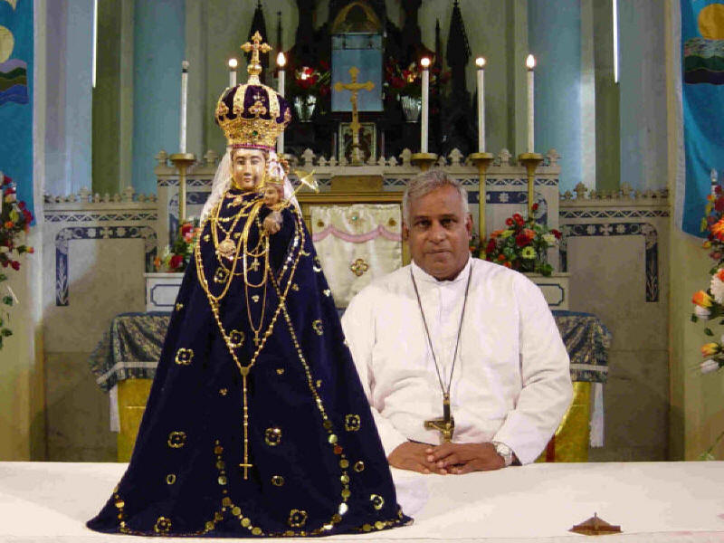 The statue of Our Lady of Madu, a priest is seated behind [Photo courtesy: Mannaar Diocese]