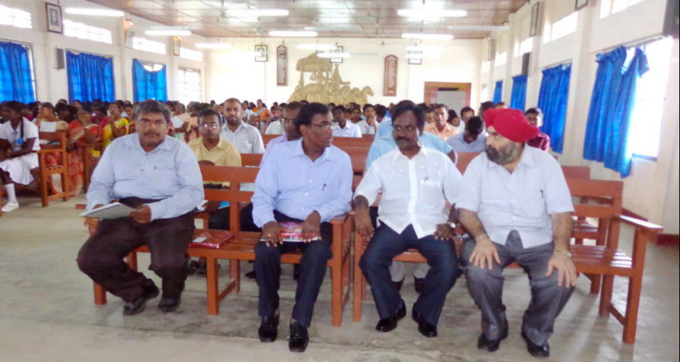 Indian Consul [second from right] at Jaffna Central College. The background shows Gitopadesha panel